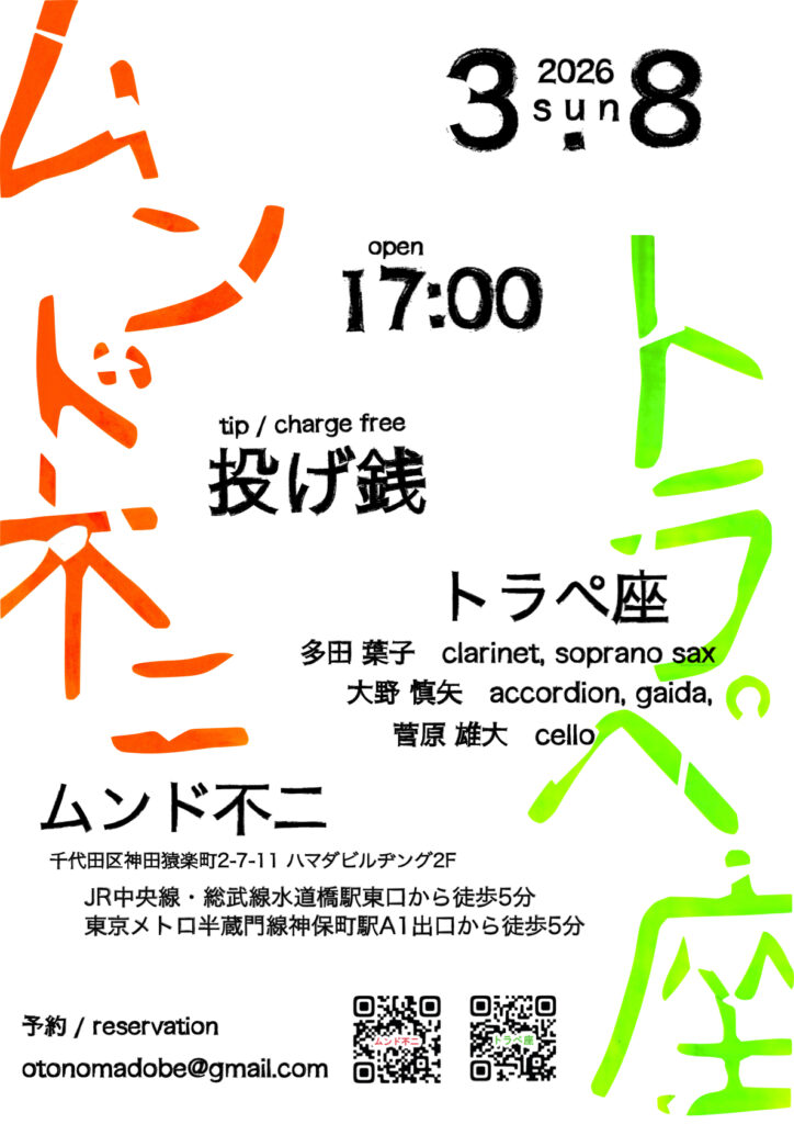 予約→otonomadobe@gmail.com (トラペ座) または出演者まで